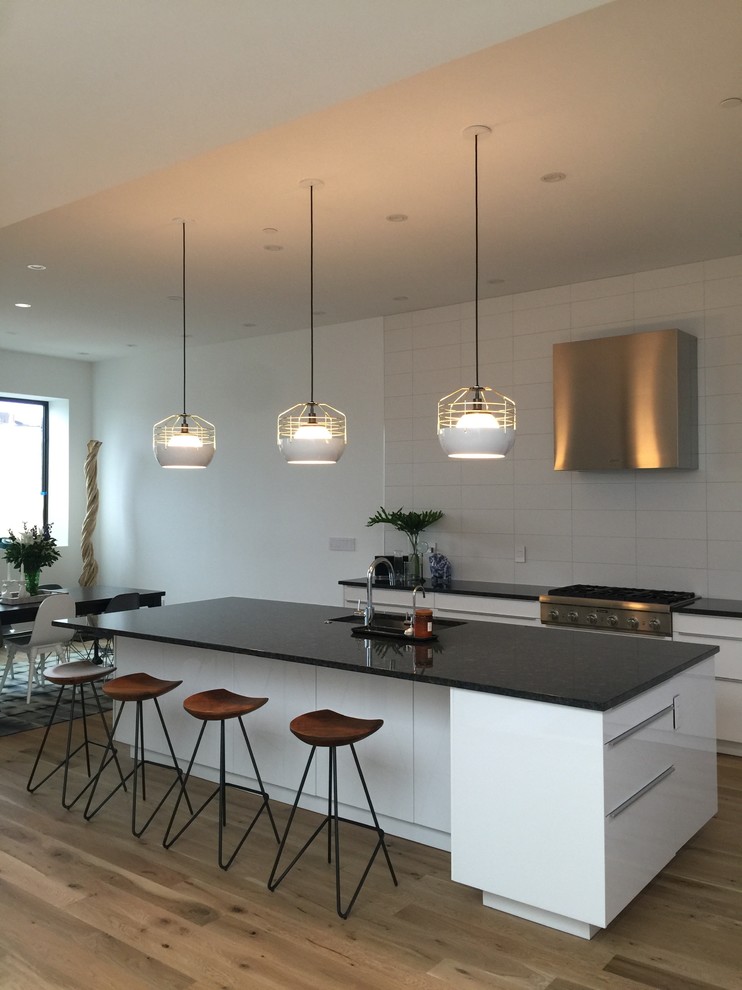 Our contractor and his team (sjbuildit.com) did a great job with the kitchen install–even with a last minute layout-flip of all the tall cabinets–love their modular design! High gloss white cabinetry. Steel Grey granite, after much deliberation between granite, quartz and marble. We also debated polished vs honed countertops and determined that honed would be less forgiving, so we opted for polished granite.